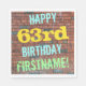 Den pappra napkin-designen med roligtens födelsedag innehåller ett meddelande som "LYCKLIG 63:e BIRTHDAY, FIRSTNAME!", där namn kan vara personlig. Bakgrunden är en återgivning av en tegelvägg som består av några rödbruna tegelstenar av färgad. Anpassadets meddelandetext har färg som blått, gult och grönt, och det har ett utseende som inspirerats av den målade graffiti. Napor som dessa kan kanske användas i en födelsedagsfest till någon som firar sin sextiotredje födelsedag. [~Z0000271]