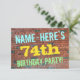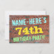 Den här födelsedagsfest inbjudan-roligten har ett meddelande som "NAMN-HERE's 74:e FÖDELSEDAGSFEST!", där namn kan vara personlig, på framsidan. Bakgrunden är en återgivning av en tegelvägg som består av några rödbruna tegelstenar av färgad. anpassadets meddelandetext på framsidan har färger som blått, gult och grönt, och det har ett utseende som inspireras av målad graffiti. Baksidan innehåller ett anpassade som kan innehålla relevant information om födelsedagsfesten. Födelsedagsfest inbjudan som detta kan vara ett roligt för inbjudan familj och vänner till en födelsedagsfest som hålls för någon som firar sin sjuttiofjärde födelsedag. [~Z0000287]