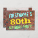 Födelsedagsfest inbjudan-designen i roligt innehåller ett meddelande som "FIRSTNAME's 80:e FÖDELSEDAGSFEST!", där namn kan vara personlig, på framsidan. Bakgrunden är en återgivning av en tegelvägg som består av några rödbruna tegelstenar av färgad. Anpassadets meddelandetext på framsidan har färg som blått, gult och grönt, och det har ett utseende som inspirerats av den målade graffiti. Baksidan innehåller ett anpassade som kan innehålla relevant information om födelsedagsfesten. Födelsedagsfest inbjudan som detta kan vara ett roligt till inbjudan familj och vänner till en födelsedagsfest som hålls för någon som firar sin åttioårsdag. [~Z0000287]