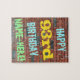 Den här roligtens födelsedagskalemetterade pussel har ett meddelande som "LYCKLIG 93:e BIRTHDAY, NAMN-HERE!", där namn kan vara personlig. Bakgrunden är en återgivning av en tegelvägg som består av några rödbruna tegelstenar av färgad. Anpassadets meddelandetext har färg som blått, gult och grönt, och det har ett utseende som inspirerats av den målade graffiti. Ett sådant pussel skulle kunna användas som roligt för att skicka önskemål till någon som firar sin nittiotredje födelsedag och som kanske verkligen gillar att göra pussel. [~Z0000285]