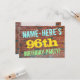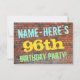 Roligten födelsedagsfest inbjudan har ett budskap som "NAMN-HERE's 96:e FÖDELSEDAGSFEST!", där namn kan vara personlig, på framsidan. Bakgrunden är en återgivning av en tegelvägg som består av några rödbruna tegelstenar av färgad. Anpassadets meddelandetext på framsidan har färg som blått, gult och grönt, och det har ett utseende som inspirerats av den målade graffiti. Baksidan innehåller ett anpassade som kan innehålla relevant information om födelsedagsfesten. Födelsedagsfest inbjudan som detta kan vara ett roligt till inbjudan familj och vänner till en födelsedagsfest som hålls för någon som firar sin nittiosjätte födelsedag. [~Z0000287]