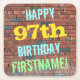 Den här roligtens födelsedagstext underlägg designfunktioner som "LYCKLIG 97:e BIRTHDAY, FIRSTNAME!", där namn kan vara personlig. Bakgrunden är en återgivning av en tegelvägg som består av några rödbruna tegelstenar av färgad. Anpassadets meddelandetext har färg som blått, gult och grönt, och det har ett utseende som inspirerats av den målade graffiti. Underlägg som dessa kan vara användbara som praktiska dekorationer i en födelsedagsfest för någon som firar sin nittiosjunde födelsedag. [~Z0000288]