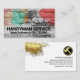 Täckningen har en vit tegelvägg som har många färgstänk. I närheten av basen hittar du affärsinformationen namn och kontaktuppgifter. På baksidan, i vitt omslag, finns detaljer på kortets höger. Längst upp finns en logotyp för hammaren i guld som du kan använda följt av ditt prestigefyllda namn, kontaktinformationen och ett sloganalternativ för bildtext. I det övre lämnat hörnet finns ett guld-färgstänk som du kan flytta runt på kortets ansikte. Ett kort för murverk, byggnad, byggföretag. #bygge #handyman #bygdentreprenör #remodeling #homerepair #byggnad #generell entreprenör #renovation #bygder #mason #masonryentreprenör #zazzlemade