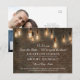 Det här Spara vykortet för datum är designat för att visa förlovningens foto på baksidan med ett meddelande till din familj och dina vänner samt bröllop webbplats, stad och stat, namn och bröllop. Perfektens blandning av rustisk chic i städerna och romantisk elegant för en informell, kärlek fylld, varm och välkomnande av bröllop firande. Bakgrunden är grov, sliten, åldras och tryckt antika tegel i djupa riker med hängande glödande Edison ljus. Med en modern typografi i stil-textlayout uppdateras contemporaryns brud och triom. Copyright, Audrey Jeanne Roberts, alla höger förbehållna.