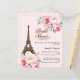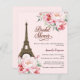A modern, stylish and glamorous invitation for a bridal shower, parisian theme. A soft blush pink background, the Paris Eiffel tower with pink roses, flowers. The name is written with a modern hand lettered style script. Personalize and add a name and party details.