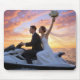 A bride and groom joyfully ride a jet ski under a stunning sunset sky