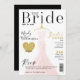 Meddela din möhippa med vår elegant, snyggt och trendigets möhippa-tidskriftsförsättningshjälp för den brud som ska visas. Inbjudningskort för möhippan är designat att se ut som en snyggt och glamorös möhippa. Bilden av den möhippa tidskriften har vår handmålade chic, elegant och moderna, helt vita och blek klädtärningar i rosa bröllop. Klänningen i bröllop hänger på en ornerad vintage-stil-klädhängare. Mjuka detaljer om blomman snöre och gnistor på bröllop-klänningen skapar ett vackert, sofistikerat och lyxigt utseende. Magasinet "Bride" skapar tidskriften namn. Texten i inbjudningskort för möhippan är designad för att se ut som text som du skulle se i en tidning. Alla illustrationer är handritade originalbilder av Moodthology Papery.