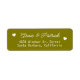 Din personlig i adress på ett enkelt sätt... Olivmärket färg med två linjer text som är centrerad, och brud och groom namn som är skrivet i en snyggt med typsnitt stil med bilden av två små vita hjärtan i kärlek.