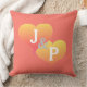 Ljusa korallbakgrund med vitaktigt turkosa skript. Solnedgång av guldfärgad gult till rosa hjärtan är reversibel Bröllop Dekorativ kudde. Anpassa hjärtan med pars monogrammade initialer. Baksidan av kudden anpassar sig efter Bride och Grooms första Namn och Bröllop Datum. Snygg bröllop-gåva till nylingarna! Original Graphic Artwork design by TamiraZDesign.
