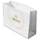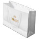Den stora presentpåsen. Skriva och blockera text i guld mot en vit bakgrund.