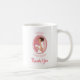 Möhippa tack mugg med ett exempel på en leende brud som håller en blombukett i sin finare vita bröllop klänning och bär en slöja. Ställ in en rosa oval ram med ett skalat gräns.