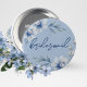 Bridesmaid Blue Möhippa Pin on Button. Med vacker dammig elegant i skiffer, blå vattenfärgblommor i ljusblå botten. Ta en titt på de andra matchningsknapparna i samlingen för andra viktiga gäster som maid of honor, brud att vara, brudgumm och så vidare!