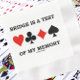 Visa din brygga/duplicera bryggspelarsida vid nästa brotematiska händelse med denna pappra napkin som innehåller kostym med fyra kort och orden "Bridge is a Test of My Memory" (Bridge är ett test av mitt minne). Ledamot Bron som säger papper napkin för alla bryggspelare som försöker komma ihåg vilket kort som spelades på det förflutna.