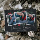 Elegant och festive-helgdag-fotokort ramar tre av dina favoritfoton i kvadraten med en subtil deckled kant gräns och röd och grönt helgdag-löv som tittar ut i hörnen. "Fred på jorden" visas längs grund i ett vitt kalligrafiskt skript, med namn och året under.
