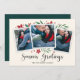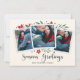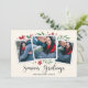 Elegant och festive helgdag-fotokort ramar tre av dina favoritfoton i kvadraten med ett subtivt deckled kant gräns och röd och grönt helgdag blad som pendlar ut i hörnen, på en mjuk elfenbensbakgrund. "Säsongshälsningar" visas längs grund i ett svart kalligrafiskt skript, med namn och året under.
