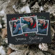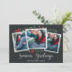 Elegant och festive-helgdag-fotokort ramar tre av dina favoritfoton i kvadraten med en subtil deckled kant gräns och röd och grönt helgdag-löv som tittar ut i hörnen. "Säsongshälsningar" visas längs grund i ett vitt kalligrafiskt skript, med namn och året under.