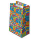 Denna presentsäck har en modern ljusa färger utformning i mitten av århundradet som gör rundade rektanglar med andra rektanglar inuti som bildas av en samling linjer.