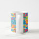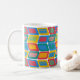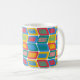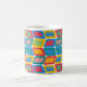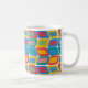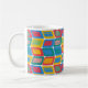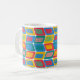 Mugg har en modern utformning av ljusa färger i mitten av århundradet som gör rundade rektanglar med andra rektanglar inuti som bildas av en samling linjer.