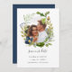 Elegant botaniskt sparar datumet ett favoritfoto av förlovningen omgivet av en rund krans av akorn och löv i en vattenfärgspalett av grått och grönt med fast blåa blommor i elegant. Anpassa med namn, datum och plats för bröllop.