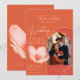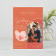 En modern bröllopsinbjudan i trendig, smart orange och grapefrukt röd. Orangens skugga heter Verona Sunset. Detaljer i Faux guld, en silhuett av en känslig blomma. Modern typografi och foto i bågform.