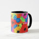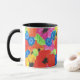 En skarp färgad ringer mugg till hiss, med en sjudande färgad mönster av poppies och kornblommor, från en handmålad design av Judy Adamson.