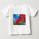 Hösten har några av årets bästa färg. Det här fotografiet fångar kärnan i det briljanta röda färgen en del av löven i fall. Bild har en linje av träd mot starkt solljus på en falldag med blå himmel i bakgrunden.