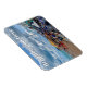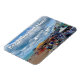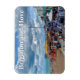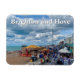 Brighton Beach är full av aktivitet och har Västerns pierkvarlevor i avstånd och en pulserande karusell med röd och gult-kanopi i förgrunden. Kajen är livlig med besökare och himmel är prickat med fluffa moln mot en ljusblå bakgrund.