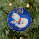 Julprydnad | Lägg till Namn och datum och budskap fram och tillbaka - På en briljant blå bakgrund Den här handmålade vita enmajsen är försedd med en poinsettia och en hollisk julkrans runt nacke och en blommigt i förhuvudet - hon har ett vackert spiral- och guld horn och en långvandrande mane och svan. Hon är verkligen en skönhetens sak - baksidan är samma blå bakgrund med guld rulla överst och grund och ord JOY i manuset guld finare kalligrafi - Artwork skapat och stolt undertecknat av ©WhimsicalArtwork™. Detta är en del av en blandning och matcha Magic Unicorn-julsamlingen.
