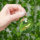 Den här lysande nyckelkedjan i kryp har ett detaljerat makrofoto av en liten färgad i gulten med bruna markeringar som trycks på en hollyhock löv. I fotografiet kan du se undersidan av vingar, päls på baksidan, dess utbuktande öga och dess bruna och vita ben. Man kan också se att det har upplösts sitt matande rör för att testa om hollyhock löv är mat eller inte.