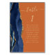 Det moderna kortet för bordsnummer i bröllop, som är lämnat kant i eleganten, har en marin blåfärgad agate i gräns som trimmas med faux guld glitter. Ord "bord" visas i handskriftsskriptet guld-färgad på en bränd orange-bakgrund. Lägg till namnen för de gäster som tilldelats varje bord.