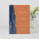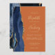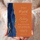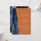 Den moderna bröllopsinbjudan från elegantens lämnat kant har en marin blå vattenfärgsagat gräns som trimmas med faux guld glitter. Anpassadet kombinerar handskrift, rityta och kursivt typsnitt med guld-färgad på en brinnande orange. Den omvända sidan har en matchande marin blå och guld-agate-design.