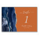Det moderna kortet för bordsnummer i bröllop, som är lämnat kant i eleganten, har en marin blåfärgad agate i gräns som trimmas med faux silver glitter. Anpassadet kombinerar handskrift av silver grått, kursiv och mönsterbaserad typsnitt på brinnande orange.