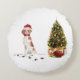 Ett stiligt brittany hund aveln är sitta vid sidan av ett dekorerat Julgran. Paket väntar på att öppnas! Hund bär en tomathatt med en röd buggslips. Lustigt att skicka den här julhelgen!