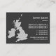 Ett affärskort med karta på de brittiska öarna. Företagsdetaljer på framsidan med namn och kontaktuppgifter på baksidan i ett tonalt stil som kontrasterar framsidan.