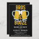 Denna coola och roliga bröllopsinbjudan till möhippa är perfekt för killarna. Den har gula, vita och blå handmålade ölmuggar som skålar med texten "Bros and Booze" ("Bröder och sprit") på en svart abstrakt mönstrad bakgrund. Den är modern, manlig och rolig; den perfekta designen för dina bröder.