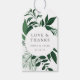 Fäst dessa eleganta botaniska etiketter på era bröllagspresenter för att tacka era gäster i chic stil. Vita etiketter har en rund ram av vintergrönska i färska nyanser av jägaregrön, som inramar "kärlek och tack" samt era namn och bröllopsdatum i klassisk stil. All text är redigerbar för ultimat anpassning. Designad för att matcha vår bröllopssamling Vild Skog.