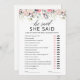 Överge dig åt det blommande elegansen i ett anpassningsbart rosa blommigt 'Han sa, hon sa'-bröllaksspelkort, perfekt för den sista festen innan ringen! Mitt i akvarell-rosa rosor och en bakgrund av bröllaksfestligheter kommer gästerna att njuta av att skapa sina egna kort, lägga till en touch av romantik och personlig anpassning till festligheterna.