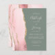 Den lämnat kant i eleganten med en modern bröllopsinbjudan har en rosa vattenfärgsagat gräns som trimmas med faux guld glitter. Anpassadet kombinerar blekens handskrift, mönstertext och kursivt typsnitt på en djup grönt. Den omvända sidan har en passande och guld agate-design.