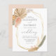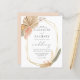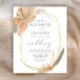 Trendigets bröllopsinbjudan innehåller ett guld-geometriskt ram som dekoreras med vattenfärgade tropiska handflatan löv och pampasgräs i nyanser av beige och muterad grönt. Anpassa texten för kol-grått med bröllop-informationen. Den omvända sidan är en koordinerande skugga av fast persikofärgat beige.
