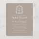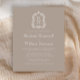 Den här vintage-inspirerade bröllopsinbjudan innehåller ett par vitt initialer i ett öppet serif-teckensnitt ovanför och under en skiljelinje och omges av en botanisk vapensköld på en taupbakgrund. Kortets baksida är en solid taupe.