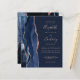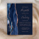 Den moderna bröllopsinbjudan från elegantens lämnat kant har en marin blå vattenfärgsagat gräns som trimmas med faux ro guld glitter. Anpassadet kombinerar handskriftsskript för ro rosa med tryckplåt och kursivt typsnitt på en marin blå bakgrund. Den omvända sidan har en matchande marin blå utformning och ro guld-agatdesign.