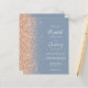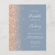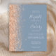 Den lämnat kant i eleganten är en modern bröllopsinbjudan som har en persikofaux glitter gräns. Anpassadet kombinerar vit handskrift, tryckplåt och kursivt typsnitt på en dammig blå bakgrund. Den omvända sidan har en passande persikofärgad glitter och dammig blå design.