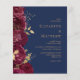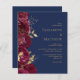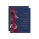 Den här romantiska bröllopsinbjudan till blommigt innehåller ett gräns av burgundblommor som är utfällda med guld faux foil foliage. Parets namn visas i det klassiska serif-teckensnittet guld-färgad, med den återstående texten i kursiv stil, på en marin blå bakgrund.