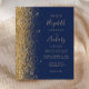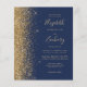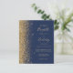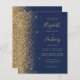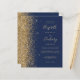 Den lämnat kant i eleganten är en modern bröllopsinbjudan från guld i glitter gräns. Anpassadet kombinerar handskrift, rityta och kursivt typsnitt i blek guld färgad med en marin blå bakgrund. Den omvända sidan har en matchande marin blå och guld-design.