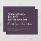 Inbjudan vänner och familj att gå med dig för bröllop firande med den här roliga bröllopsinbjudan. Texten lyder "Inget finare bara kärlek och ett öppet pub" **LÄS FÖRE KÖP** Vår serie av budgetskrivbordsåtgärder 4.5" x 5.6" och passar inuti ett A6-kuvert, som finns i alla sorters färg på din lokala kontorsbutik eller så kan du lägga till vita till din beställning innan du checkar ut. Varje lakan är en inbjudan - det krävs ingen styckning. Kardstammen är ljusvit med en halvblanka avsluta och en vikt på 110 lbs som lämpar sig för inbjudningar. Vi råder INTE dig att välja papper satängalternativ eftersom det är en mycket tunnare papper på 80 lb, vilket mer liknar journalsidor än kardstock. Om du vill ha en storlek inbjudan från klassiskt 5 x 7-format som är utskriven på en 120 lb-kartong med en projektionsyta avslutar du att du kan överföra den här designen till ett vanligt kort med hjälp av överföringsdesignalternativen. Platta kort ingår inte i budgetområdet, men du har ett större urval av storlekar och lageralternativ och de frakter med kuvert. Den form och den storlek som passar bäst för designen visas i alternativen för designöverföring. Om du gör ändringar i formen eller storlekt eller väljer en annan produkt och designen beskärs på något sätt eller inte ser höger ut på sidan måste du använda Live Design Service så att någon kan justera layouten åt dig, om du inte gör det bekvämt själv. Din beställning går direkt till skrivarna så det du ser på skärm är vad som kommer att skrivas ut och skickas till dig. Med detta i åtanke bör du också trippelkontrollera om det finns stavfel eller felaktiga uppgifter innan du ställe din beställning.