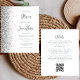 Den lämnat kant i eleganten är en modern bröllopsinbjudan från silver i glitter gräns. Anpassadet kombinerar grått-skript och sans serif typsnitt på vit bakgrund. Den omvända sidan ger plats för bröllop-information på en solid vit bakgrund, tillsammans med en QR-kodgäst som kan söka på webbplatsen och OSAN, vilket sparar kostnaderna för utskrift och utskick av separat OSA kort.