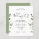 Budget Chic Eucalyptus Greenery bröllopsinbjudan. En vacker modern vattenfärgsdesign med elegant handskript. Anpassa den här snyggten Eucalyptus greenery inbjudan med bridens och gruppens händelseinformation om namn/bröllop.