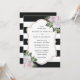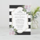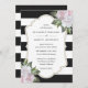 Inbjudan dina gäster till elegantens svarta och vita bröllopsfest med de här inbjudningarna till blommigten för rosa som innehåller rosa blommor och grön på en svart och vit, rand bakgrund.