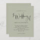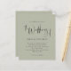 Brölloksinbjudan till Grönten Script Sage Blek En pris SMALLER på 4,5 x 5,6 tum. Finns i ett SEMI-GLOSS 110 lb-kort LAGRAR, vilket är standardalternativet (tjockare för inbjudningar), ELLER SATIN AVSLUTAR 80 lb PAPPER LAGRAR (perfekt för bilagor). Kuvert är ett extra som tillval och är något större än det storleka kortet. Denna elegant har en snyggt som ställer in typografi i svartvitt för huvudrubriken Bröllop från på en ljussken grönt bakgrund. Resten av texten kan du enkelt anpassa.