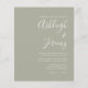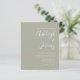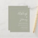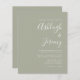 Den här enkla, moderna bröllopsinbjudan innehåller vit text på en sidas grönt bakgrund. Lägg till bildens och bildens namn i snyggtens handskriftsgrafi och detaljerna i sans serif-teckensnitt. Baksidan är en matchande skuggning av solid sage-grönt.